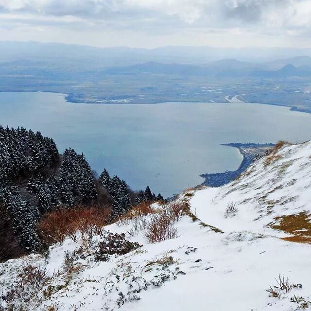 搭缆车到滑雪场的途中,可以从1000米的高空俯瞰雪中的琵琶湖。