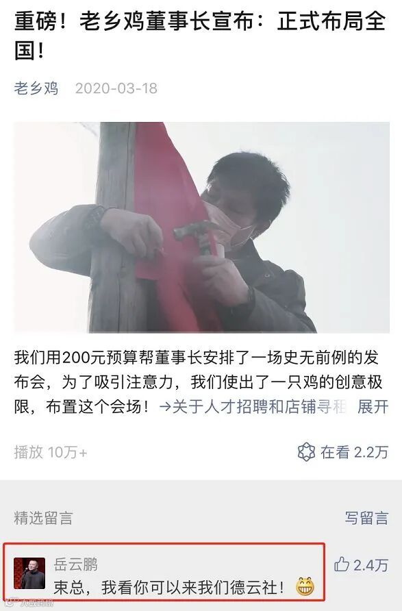 继“手撕”员工联名信视频后, 3月18日晚上,老乡鸡在其微信公众号发布的“土味”战略发布会视频同样火遍了全网,甚至吸引了岳云鹏前来留言点赞。