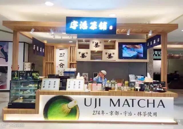 宇治是日本京都的一个地名,坐标在北纬36度,跟中国山东的日照同纬度,是世界上最适合种植茶叶的地方,宇治的绿茶在日本非常出名,而抹茶则是选用最上等的宇治绿茶,取其最嫩的部分,碾磨、蒸青而成的。宇治茶铺的概念来源于宇治伊藤久右衛门家族,有近300年的历史。