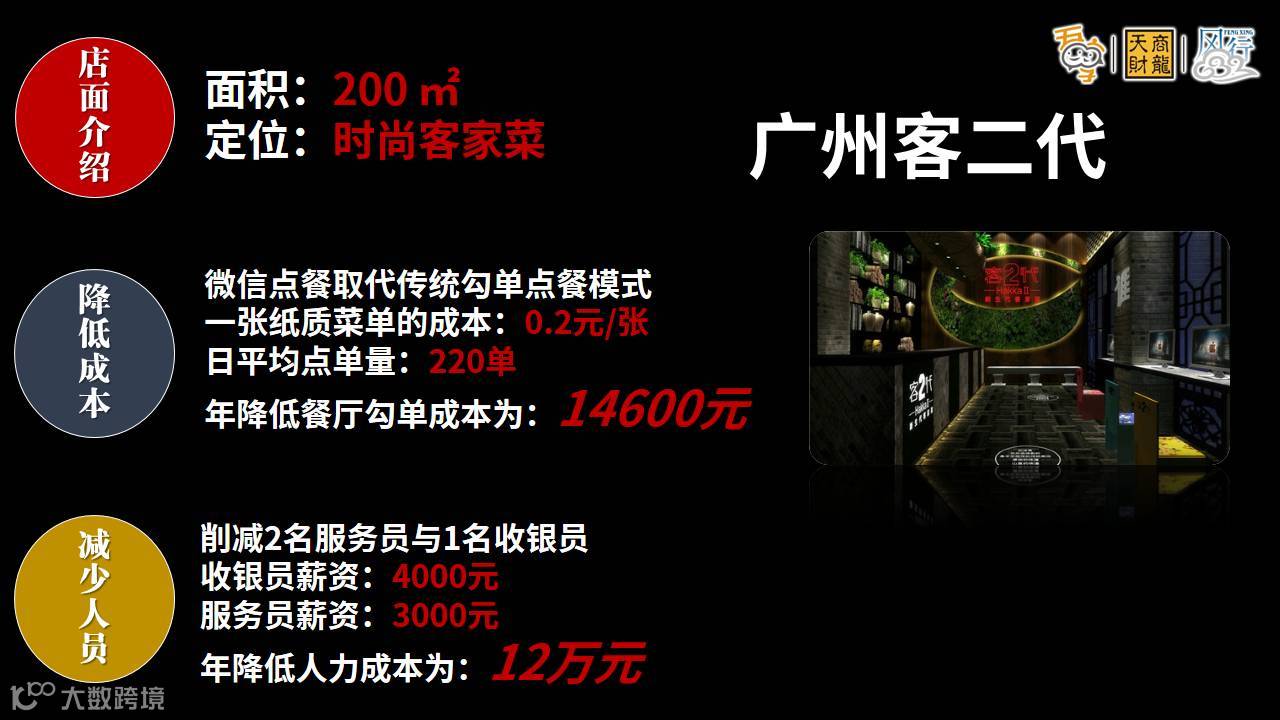 借用智慧餐厅在惠州客二代的成功落地,可知,微信点餐功能上线四个月时间,为餐厅实现削减2名服务员与1名收银员的效果。按照目前惠州当地的薪资水平来讲,1名服务员的月收入3000元,1名收银员的月收入4000元。简单计算,便知餐厅全年可节约人员成本12万元。