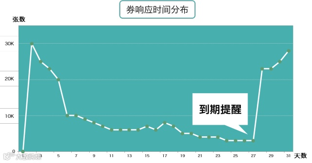 具体来讲,下面是该餐厅电子券响应时间分布图趋势图,从图上可以看出,电子券的使用在发放券之后的一周时间最活跃,之后缓慢下沉并逐渐趋于平淡。餐厅可根据电子券有效期的时间设定,在电子券到期前一周时间设置“到期提醒”,收到提醒的食客,会再一次被唤醒。