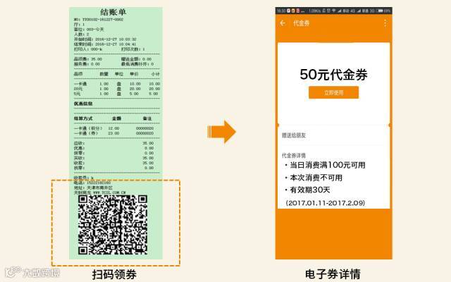 电子券当天不可用。食客用餐完毕,扫描结算单底端的二维码,即可获取50元代金券,代金券规定下次消费可用,30天有效期。