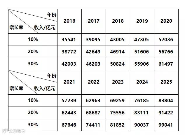 那如果按年增长10%、20%、30%来推算下,看看未来10年会怎样?