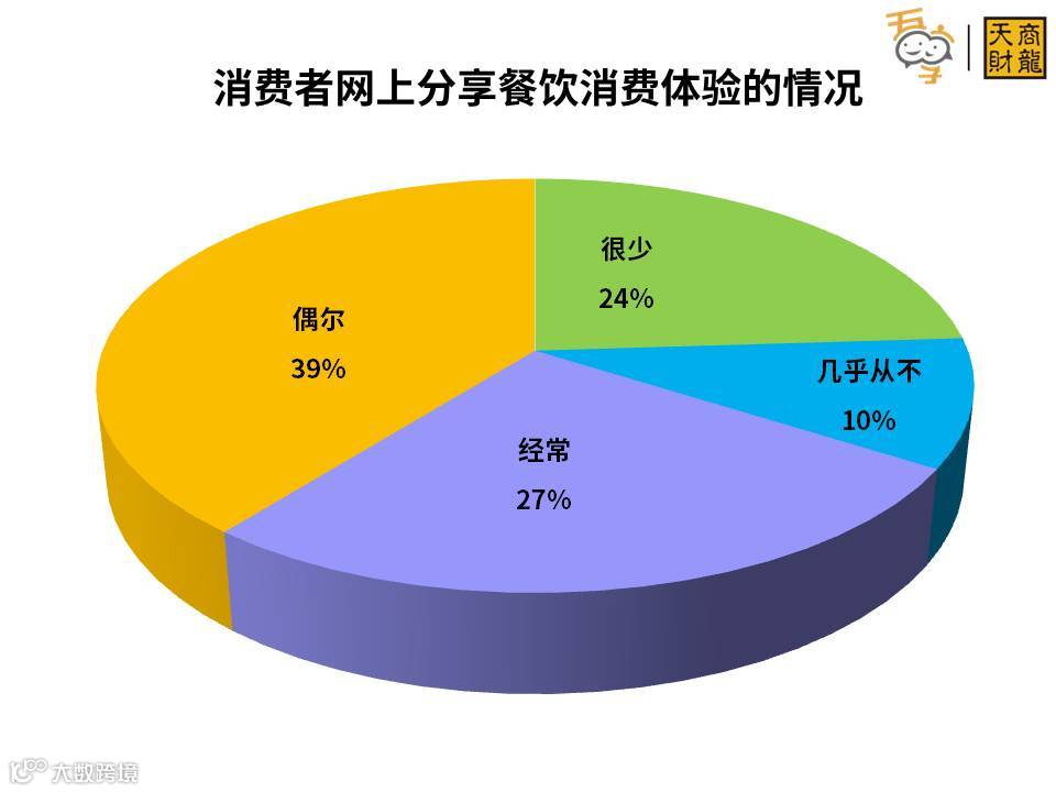 据调查显示,经常在社交平台分享餐饮消费体验、发表评论的受访者占到26.7%,偶尔进行分享的达到39.3%,超过半数的人会将印象深刻的餐饮消费体验在网络平台上与其他人进行分享。