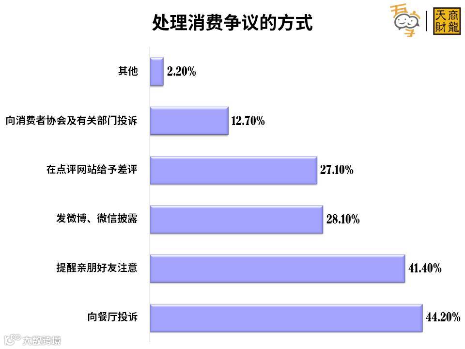 同时,在发生消费争议后,44.2%的受访者会向餐厅投诉,41.4%会提醒亲朋好友注意,28.1%会发微博、微信披露,还有27.1%会在点评网站上给予差评,而向消费者协会及有关部门投诉的比例则从之前调查的44.8%下降至12.7%。