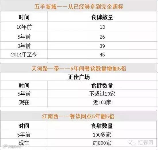 根据《美食导报》的统计数据显示,在广州一些大型商业闹市区,新增加的食肆数量与5年或10年前相比,呈现爆炸式增长。尤其是罗冲围地区,近10年餐饮店数量增长几乎达到300%。