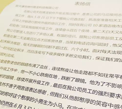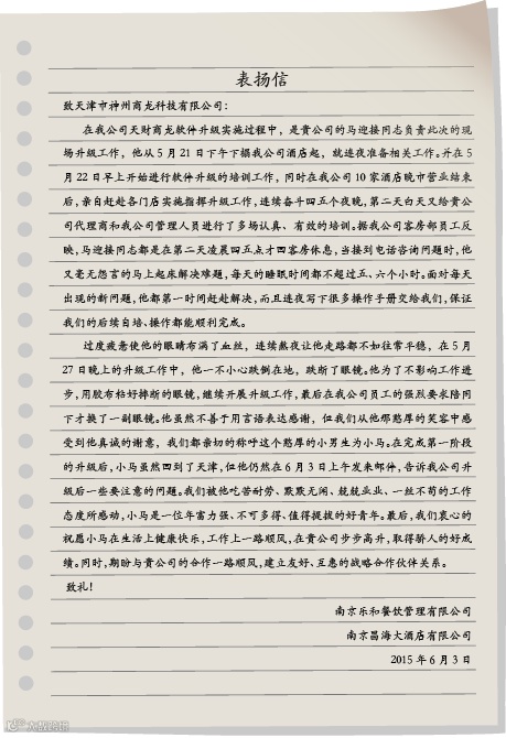 客户寄来的写给马迎接的表扬信里解读了一位将对梦想的热情转化为高度集中的工作责任感的正