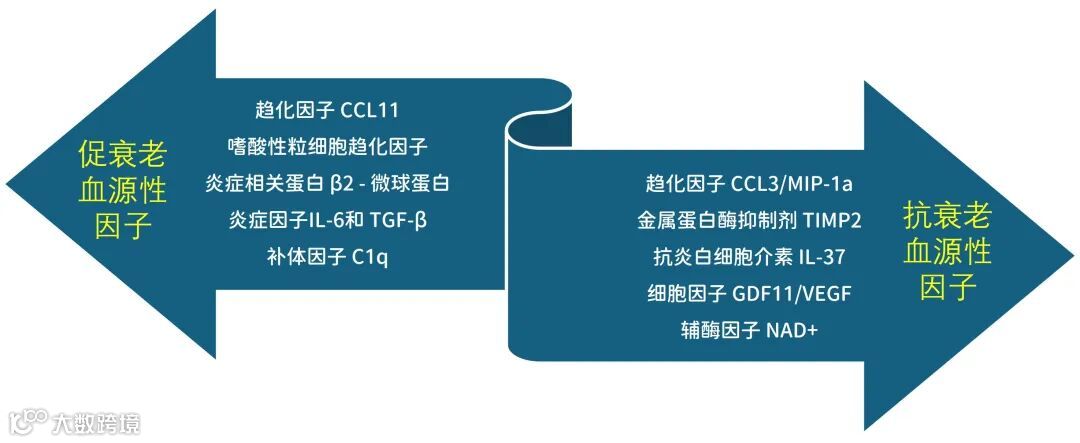 年轻血液能够使多个组织年轻化,并恢复与年龄相关的整体基因表达下降,特别是参与电子传递链的线粒体基因的表达下降 [5]。趋化因子 CCL3/MIP-1a 可以使造血祖细胞年轻化;金属蛋白酶抑制剂 TIMP2 与海马体的年轻化有关;抗炎白细胞介素 IL-37能提高老年小鼠的耐力运动能力并改善全身代谢;细胞因子 GDF11能使肌肉、大脑和内分泌胰腺年轻化,但具有促纤维化副作用;转基因过表达 VEGF 的小鼠表现出肝脏和肌肉修复增强、整体健康状况改善,平均寿命延长 40% [6]。
