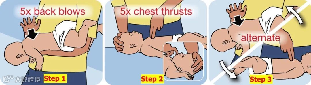 把幼儿面部朝下趴在手臂上,手托着幼儿的颧骨、下颚及胸颈,小心不要盖住口鼻,头部放下。以手掌根推打幼儿背部两肩胛骨之间的位置五次,再将幼儿翻转朝上,固定幼儿后脑勺,另一只手的两指放于婴儿两乳头连线中点往下约一指处(避开腹部免压迫肝脏),用力按压五秒,深度约2.5厘米,放开一秒再重覆,随时留意是否有异物吐出。