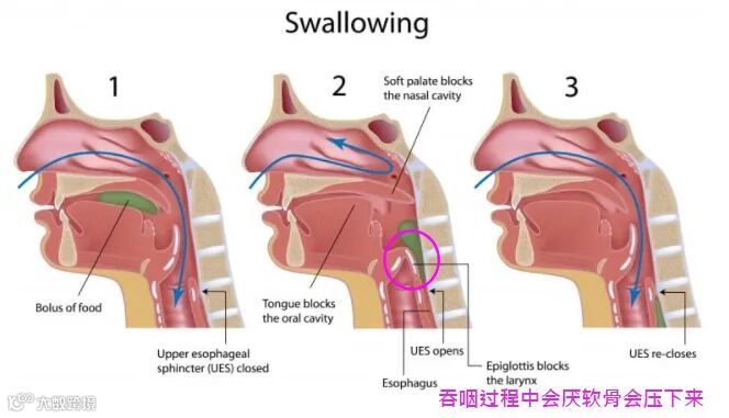 吞咽过程中,喉部的会厌软骨正常会压下来,像盖子一样覆盖着气管,防止食物误咽进气管。但会厌软骨的肌能会随年纪增长而退化,就如盖子开关太多次,没能盖好导致误咽的机率便会增加。如果曾中风的人士,对肌肉的控制能力较弱,吞咽功能不健全,就更容易呛到。所以大夫会建议不要让容易哽塞的长者吃流质食物如汤类及稀粥,又或需事先食物中添加凝固剂,亦是这个原因。