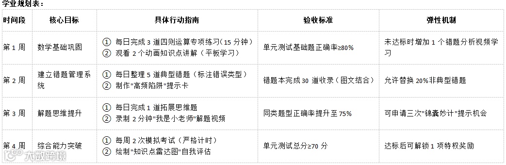 关键动作:诊断基础漏洞(四则运算不熟)→ 重学四年级课程 → 每天15分钟专项突破