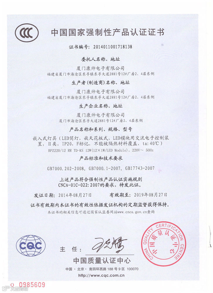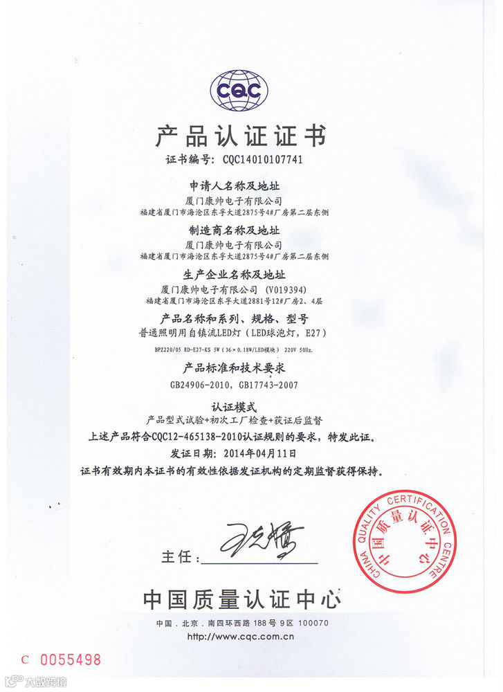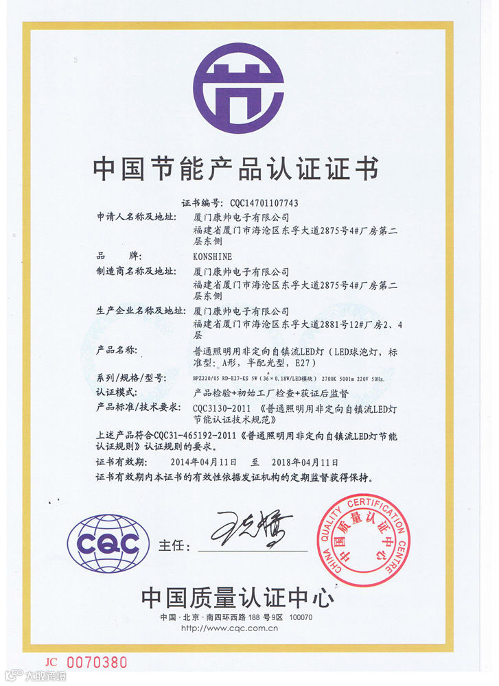 康帅照明LED5W、7W球泡灯、12W筒灯分别取得CQC认证及节能证书!