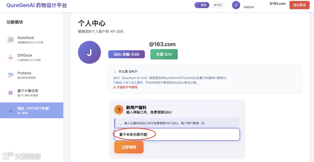 注意:注册账号并登录后,输入专属口令“量子未来无限可能”,领取量子算力。