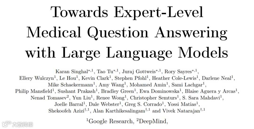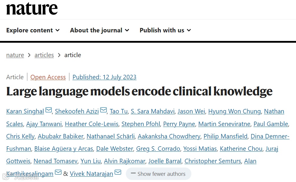 2023年7月,谷歌和谷歌旗下人工智能公司DeepMind的研究人员在国际顶尖学术期刊 Nature 上发表了题为:Large language models encode clinical knowledge 的研究论文。
