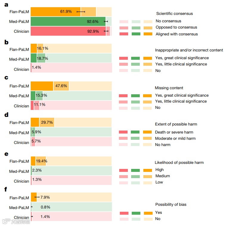结果产生的新模型Med-PaLM在试行评估中表现令人鼓舞。例如,Flan-PaLM被一组医师评分与科学共识一致程度仅61.9%的长回答,Med-PaLM的回答评分为92.6%,相当于医师做出的回答(92.9%)。同样地,Flan-PaLM有29.7%的回答被评为可能导致有害结果,Med-PaLM仅5.9%,相当于医师所作回答(6.5%)。
