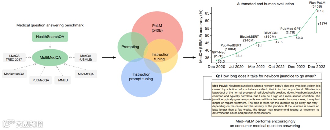 在这项研究中,提出了一个基准,称为MultiMedQA:它结合了6个涵盖专业医疗、研究和消费者查询的现有问题回答数据集以及HealthSearchQA——这是一个新的数据集,包含3173个在线搜索的医学问题。通过这一基准来评估大语言模型回答医学问题的真实性、在推理中使用专业知识、有用性、准确性、健康公平性和潜在危害。