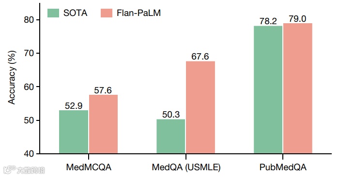 研究团队随后评估了PaLM(5400亿参数的大语言模型)及其变体Flan-PaLM。他们发现,在一些数据集中Flan-PaLM达到了最先进水平的表现。在整合美国医师执照考试类问题的MedQA数据集中,Flan-PaLM超过此前最先进的大语言模型达17%,达到了67.6%的准确率,达到了通过考试的标准(60%)。不过,虽然FLAN-PaLM的多选题成绩优良,进一步评估显示,它在回答消费者的医疗问题方面存在差距。