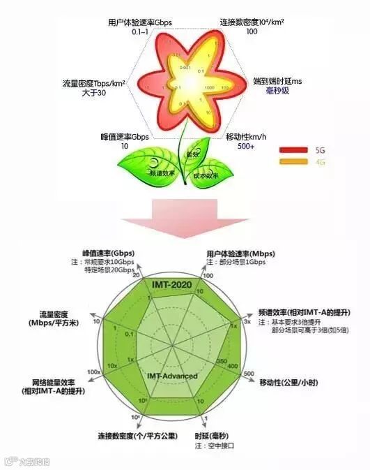 我国对5G需求开展了深入研究,提出了5G之花,包含9大性能指标的5G关键能力指标体系,除成本效率指标外,其他8个关键性能指标都被ITU采纳,即用户体验速率、流量密度、峰值速率、连接数密度、空口时延、移动性、频谱效率和能量效率,其中最突出的三个性能指标是用户体验速率、空口时延和连接数密度。
