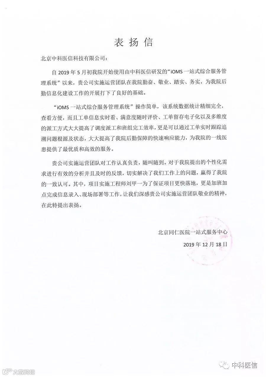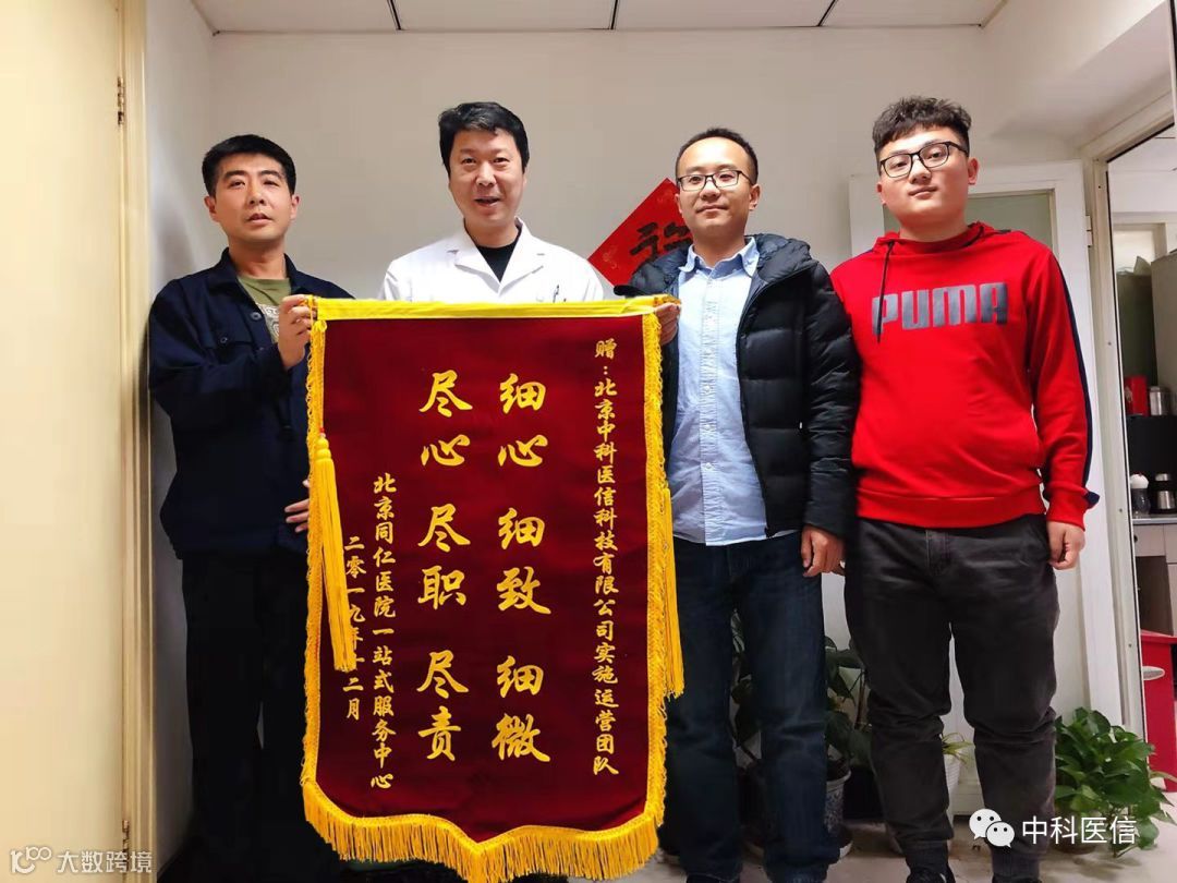 12月18日北京同仁医院一站式服务中心将一面写有“细心、细致、细微,尽心、尽职、尽责”的锦旗和一封表扬信送到中科医信负责人手中,以表彰公司项目实施人员勤奋、敬业、务实的工作态度,及“iOMS一站式综合服务管理系统”的专业、简便、精细的性能。