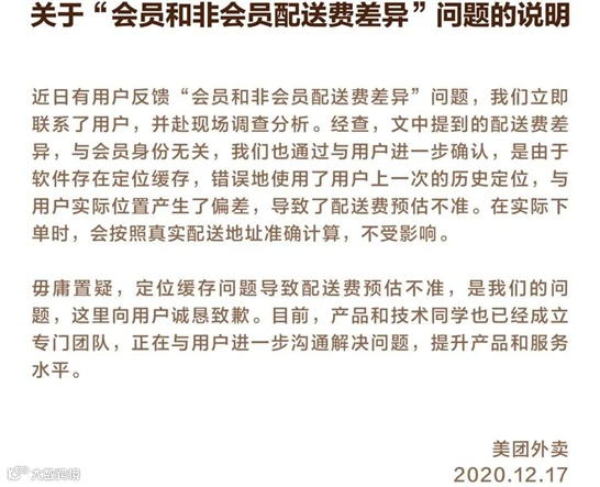 对于用户的质疑,美团外卖方面发声明回应称,配送费差异与会员身份无关,由于软件存在定位缓存,错误地使用了用户上一次的历史定位,与用户实际位置产生了偏差,导致了配送费预估不准。在实际下单时,会按照真实配送地址计算,不受影响。