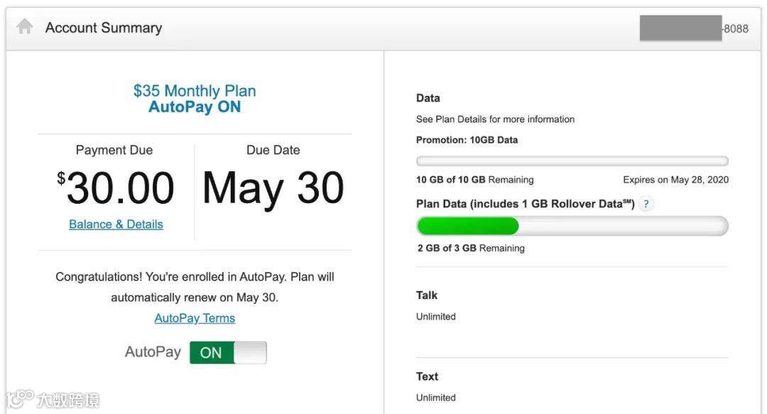 而我正在使用的美国手机套餐是AT&T最基础的预付费套餐,每月35美元(合249人民币),套餐包含每月1GB的4G流量(用完后还有2GB的2G/3G流量) + 无限通话 + 无限短信。由于我设置了自动扣费,所以AT&T每月给了我5美元折扣,实际开支是30美元/月。