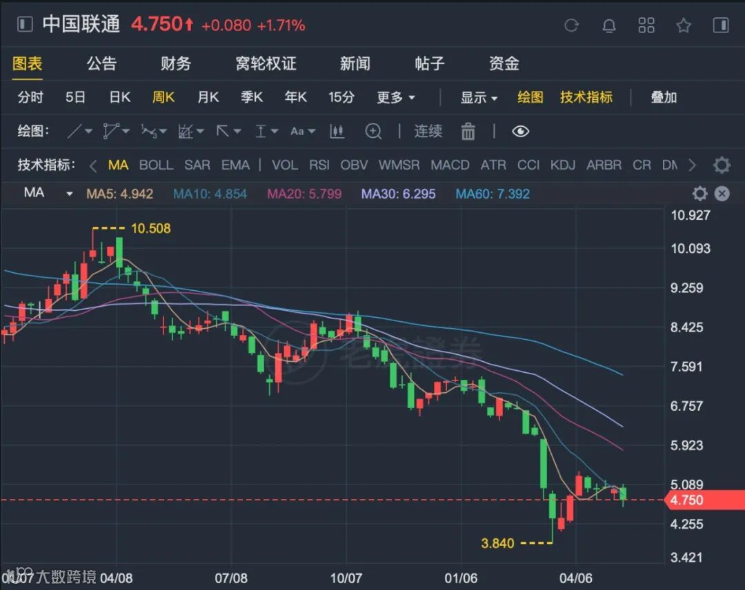 中国联通的股价从8.3港元跌至4.7港元,跌幅44%;