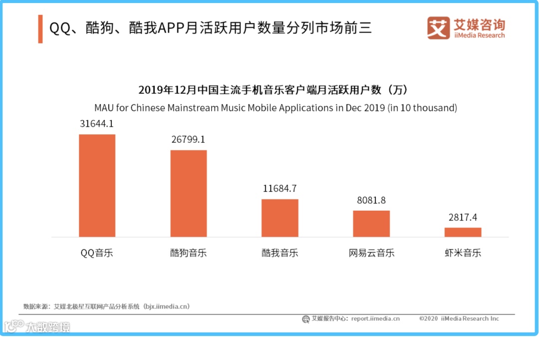 iiMedia Research(艾媒咨询)数据显示,2019年12月, 腾讯音乐集团旗下三款音乐APP——QQ音乐、酷狗音乐和酷我音乐的活跃用户数占据了市场前三的位置,分别达到31644.1万、26799.1万和11684.7万;而第四名网易云音乐活跃用户数为8081.8万。