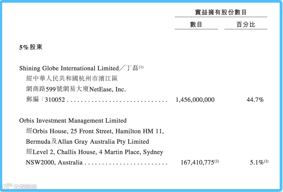 第二大股东Orbis Investment Management Limited持股数仅为1.674亿股,占总股本的5.1%,远不及丁磊。