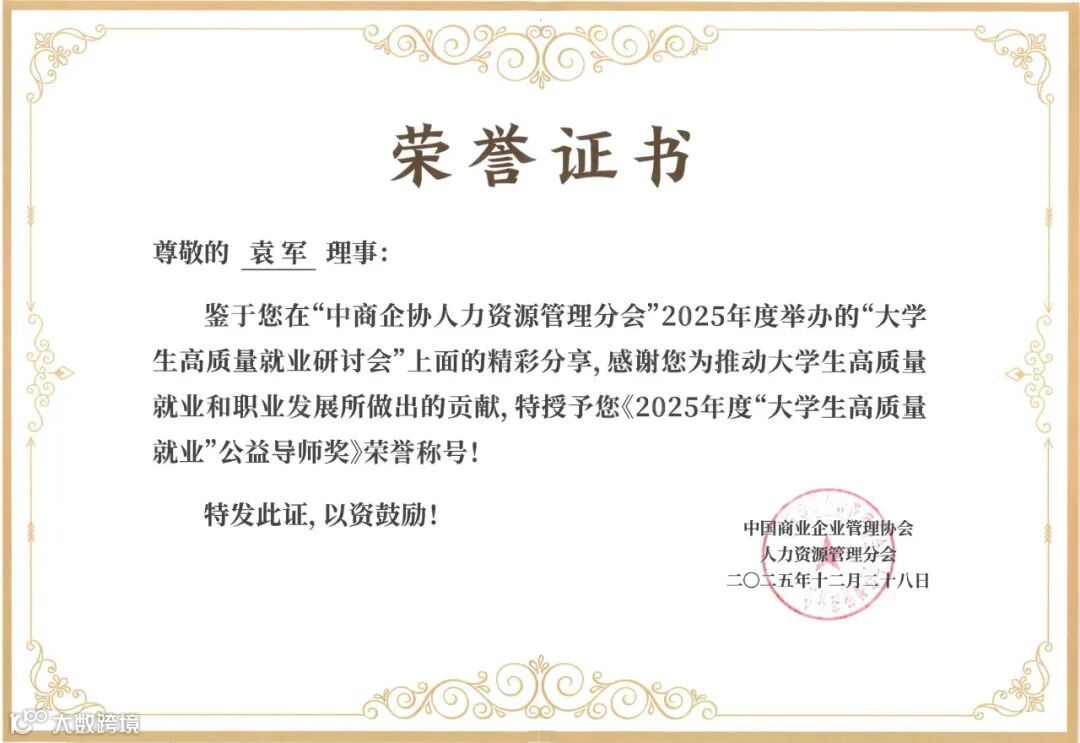 近日,行业重磅喜讯传来!菜鸟无忧董事长、总裁袁军凭借在推动大学生高质量就业领域的突出贡献与公益担当,被中国商业企业管理协会人力资源分会正式授予《2025年度“大学生高质量就业”公益导师奖》。这一荣誉不仅是对袁军老师个人深耕就业服务事业的高度认可,更是对菜鸟无忧坚守初心、助力青年成长的权威肯定。