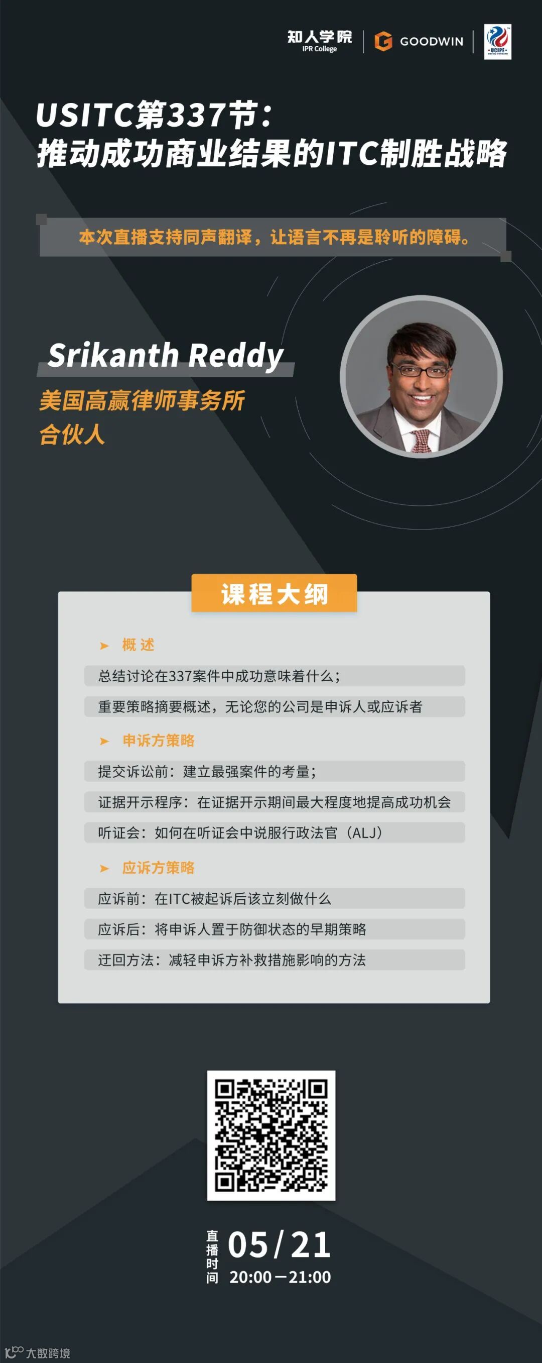 高赢国际律师事务所(高赢)联合知人学院(IPR College)在2021年5月21日晚将围绕“推动成功商业结果的ITC致胜战略”做直播分享。以下为课程大纲和讲师简介。