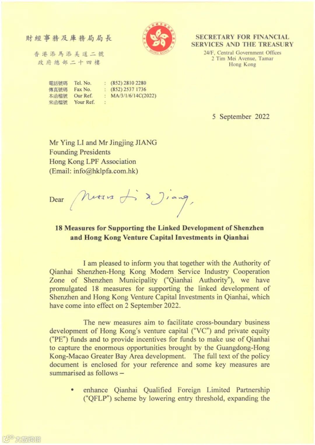 2022年9月5日香港有限合伙基金协会收到香港财经事务及库务局许正宇局长关于上周前海管理局、香港财库局联合发布的“关于支持前海深港风投创投联动发展的十八条措施”(以下简称“十八条措施”)的亲笔致信,信中感谢协会与各位协会成员对于其工作的支持,特区政府将继续与业界保持密切联系,推动香港与内地金融市场更广泛、更深入的互联互通,为产业创造更多的发展机会,希望继续得到协会的支持。