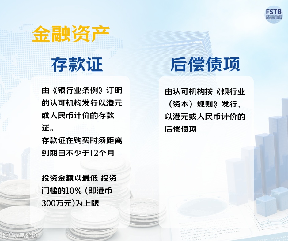 (c) 存款证—由《银行业条例》(第155 章)订明的认可机构发行以港元或人民币计价的存款证。存款证在购买时须距离到期日不少于12个月,而投资金额以最低投资门坎(即3,000 万港元)的10%为上限;