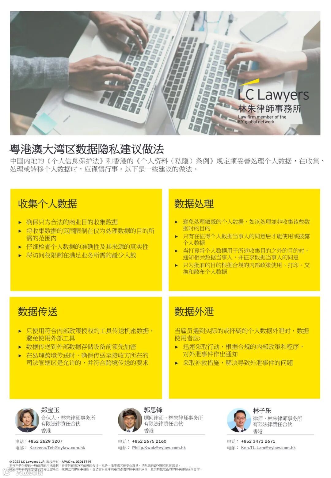 延续聚能大湾区系列,安永咨询服务有限公司和林朱律师事务所有限法律责任合伙于 2021 年 12 月 13 日举办了一场关于大湾区个人数据保护的研讨会,林朱律师事务所有限法律责任合伙的郑宝玉律师和郭思锋律师指出了于大湾区经营业务的公司面临的关键问题和须优先注意的事项,而安永咨询服务有限公司陈永诚先生及李伟伦先生分享了在中国大陆和香港应对新数据隐私法的一些合规策略及解决方案。为便于参考,我们总结了可协助组织为新数据保护法规做好准备的建议做法,欢迎下载。
