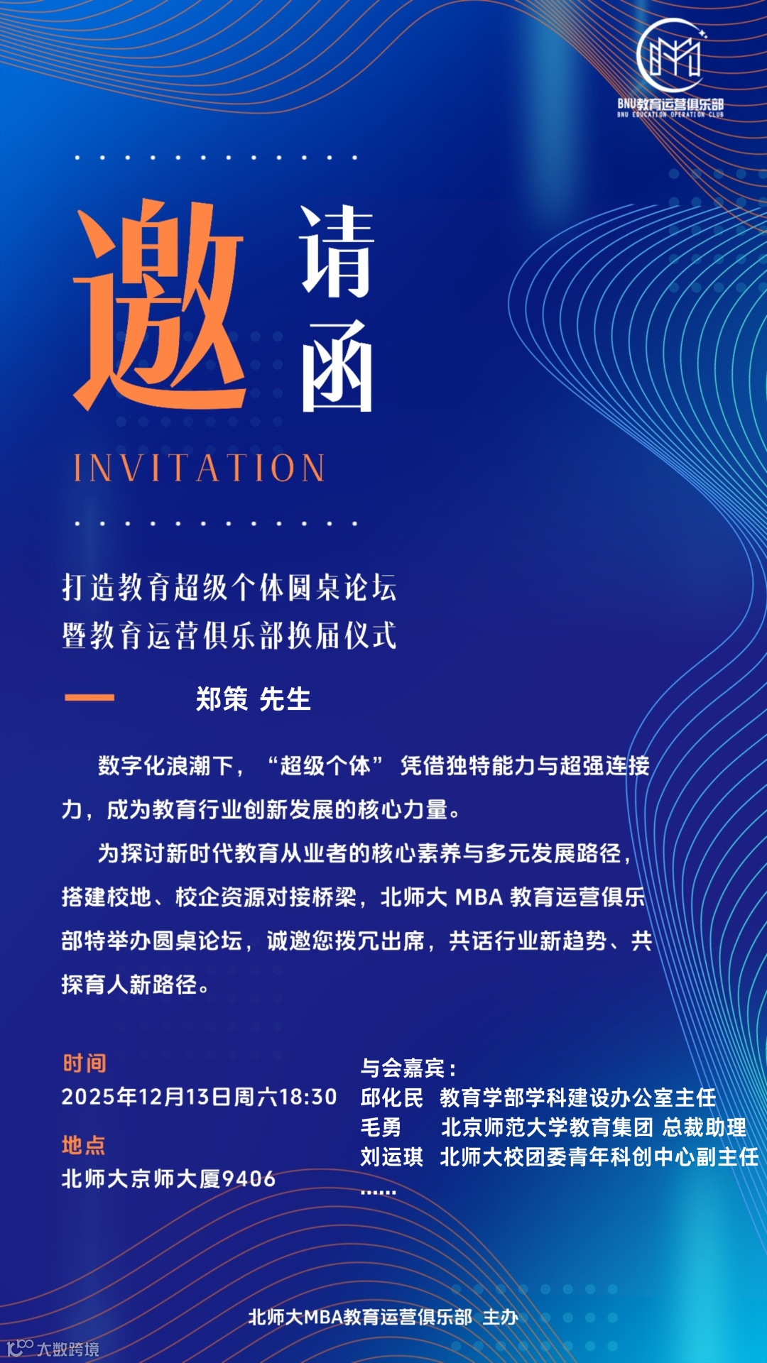 12月13日,新时代教育与就业趋势跨界圆桌论坛在北京师范大学(海淀校区)京师大厦举行。菜鸟无忧人才供应链事业部储备副总监郑策作为行业嘉宾,分享前沿洞察,阐释公司以“三支柱”体系赋能青年高质量就业的核心实践。近百人北京师范大学各学院、各专业的学子参加了本次活动。