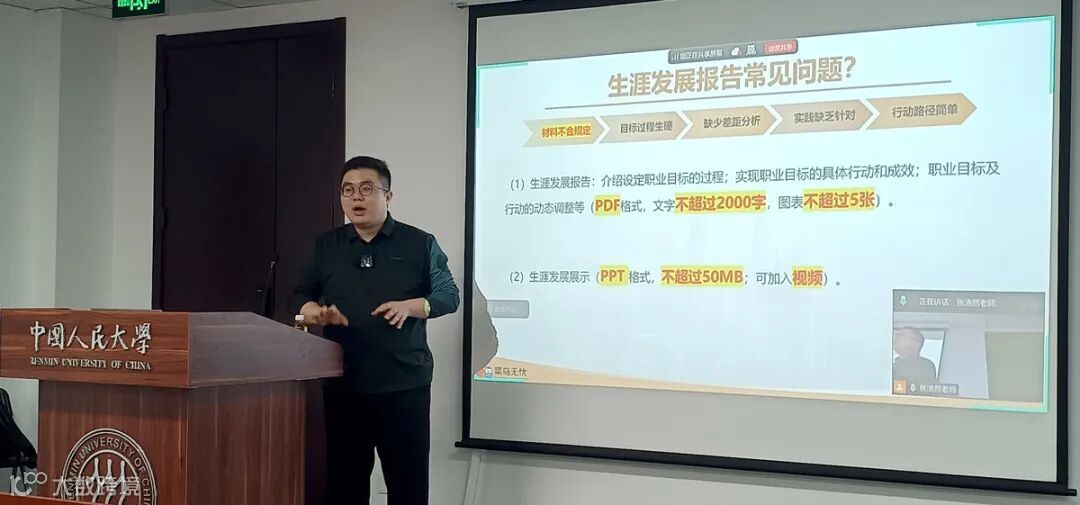 12月10日,菜鸟无忧专业导师走进中国人民大学,结合大赛评审要求,以“共性问题辅导+1对1精准赋能”的形式,为备战第三届全国大学生职业规划大赛的人大学子“把脉开方”。本次辅导由菜鸟无忧“金牌搭档”张浩然老师与冯晨老师主讲,旨在为参赛学子提供专业化、精准化的备赛指导,提升其生涯规划报告与现场陈述的专业水准。
