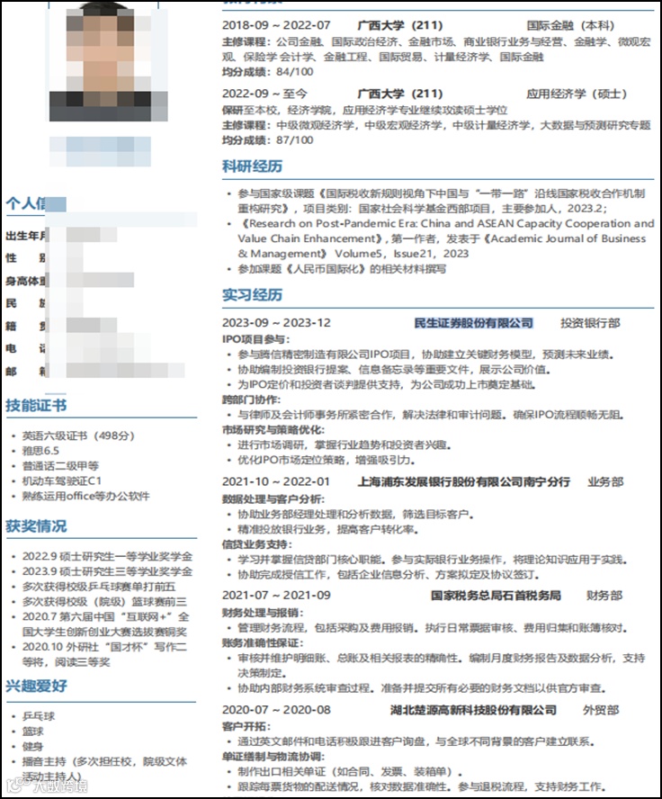 2026届应届毕业生毕同学,系广西大学国际金融专业的硕士生,现已通过英语六级,并具备在民生证券股份有限公司投资银行部的宝贵实习经验。这份经历使毕同学,不仅熟悉金融实务,也对高强度的专业工作环境有切身了解,是其求职赛道上不可忽视的竞争优势。