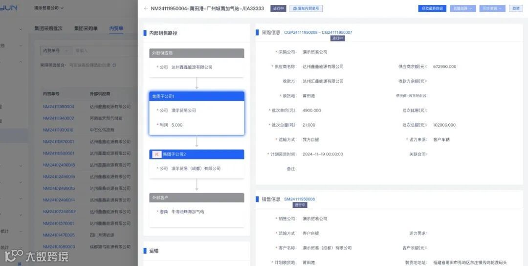 · 多组织结算管理:通过LNG云自研的集团内贸功能,将多家组织之间的贸易往来数据通过一个表单几个流转,同时生成各个明细费用。