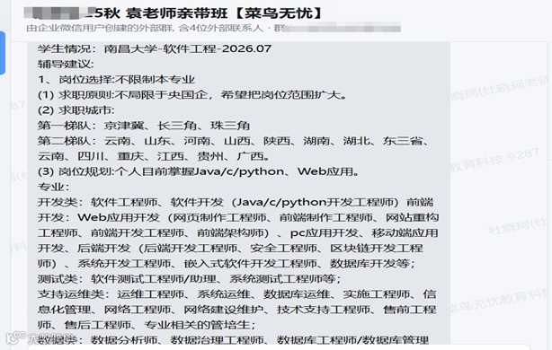 综合来看,朱同学“技术+管理+教学+艺术”的多元背景,初步展露出极大可塑性。但求职过程中,关于个人职业方向、央国企招聘时间及笔面试的困惑,让朱同学选择菜鸟无忧,为自身就业进行全方位赋能。