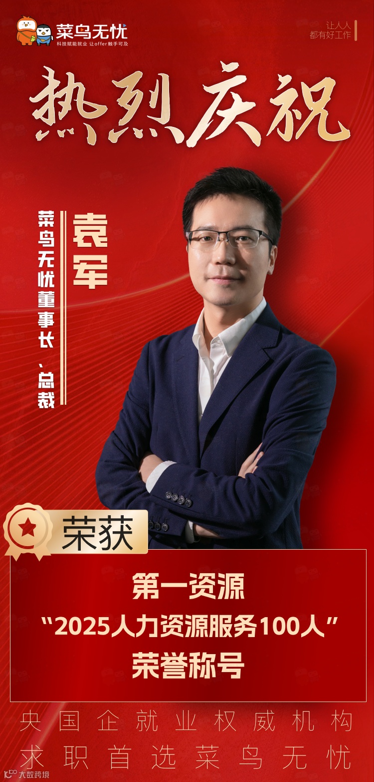 在8 月18 日这个专属于人力资源从业者的盛大节日 —— 中国人力资源日,菜鸟无忧董事长、总裁袁军凭借卓越贡献与深厚行业影响力,荣膺第一资源 “2025 人力资源服务 100 人” 荣誉称号!这一殊荣,不仅是对袁军个人卓越成就的高度褒奖,更是菜鸟无忧在推动大学生就业征程中辉煌实力的有力见证。