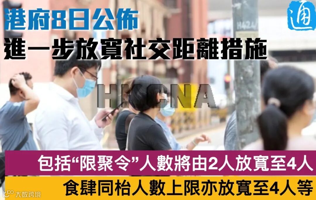 香港特区政府今日(9月8日)宣布放宽防疫措施,限聚令放宽至4人,餐饮处所可放宽至4人一桌,其他限制不变。大部分体育处所重开,游戏机中心、公众娱乐场所、表演场所、麻雀馆可重开。派对房间、夜店、泳池、卡拉OK 需暂时继续关闭。以上措施本周五凌晨生效,为期7日。