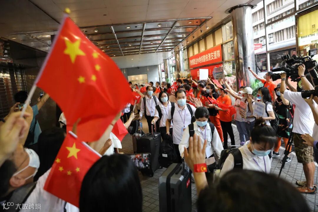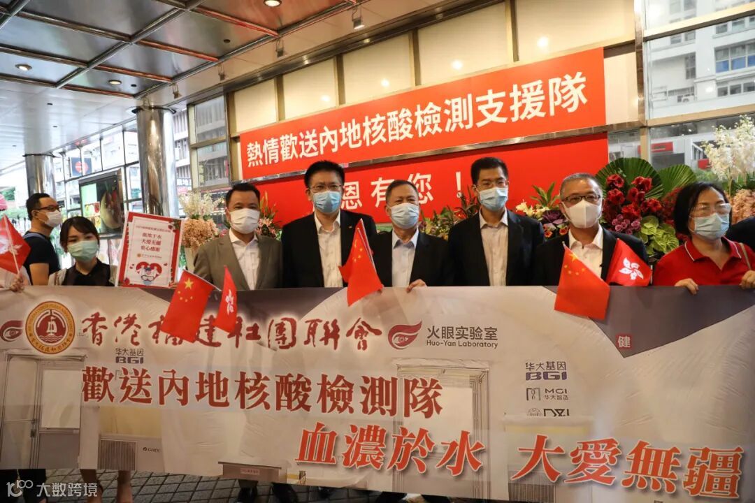 当日早上6时半许,已有市民自发来到九龙维景酒店,他们手捧鲜花、脸贴国旗贴纸,手持“血浓于水、大爱无疆、衷心感谢”的横幅,耐心等待检测队成员。
