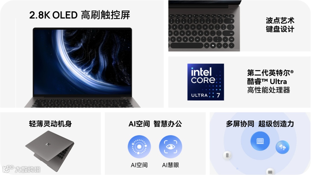Hi MateBook 14 是一款融合独特设计与强悍性能的轻薄本。其最大的辨识度来自行业首创的“波点艺术键盘”,圆形键帽兼具美学与1.5mm 舒适键程。它配备了一块 14.2英寸 2.8K OLED 触控屏,支持 120Hz 高刷新率、专业级色准与多色域覆盖,并通过莱茵护眼认证。性能上,它搭载双版本处理器:锐龙版和酷睿版,并采用高效的双鲨鱼鳍风扇散热系统,确保高性能稳定释放。此外,它内置 AI 空间,支持与手机、平板跨端协同,极大提升办公效率。