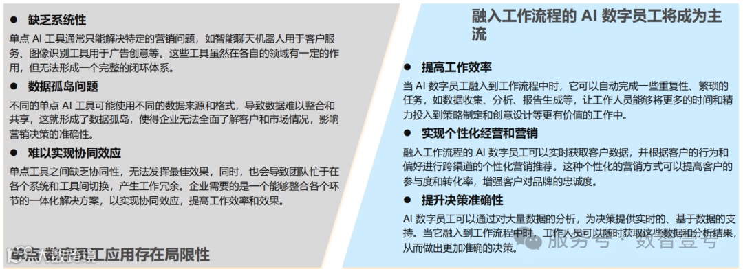 单点数字员工应用存在局限性,融入工作流程的AI数字员工将成为主流,将为企业数字化经营带来更高的效率、更好的效果和更强的竞争力。企业应积极拥抱这一趋势,将 AI 数字员工深度融入到工作流程中,实现经营的智能化、自动化和个性化。