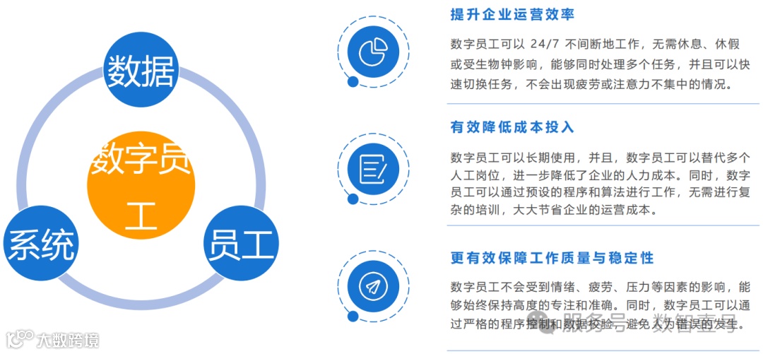 中国数智员工市场是近年来数字化转型和人工智能技术发展的重要产物,其核心是通过AI、RPA(机器人流程自动化)、大数据、云计算等技术,实现企业流程的自动化与智能化,替代或辅助人类完成重复性、规则性或高复杂度的任务。以下是关于数智员工市场的趋势分析: