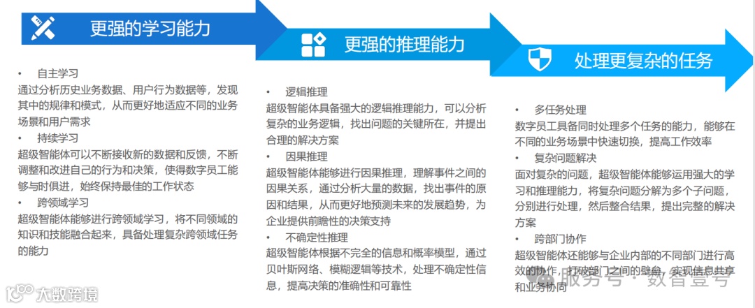 趋势1:数字员工进一步提升智能水平,成为超级智能体,具备更强的学习和推理能力,处理更复杂的任务