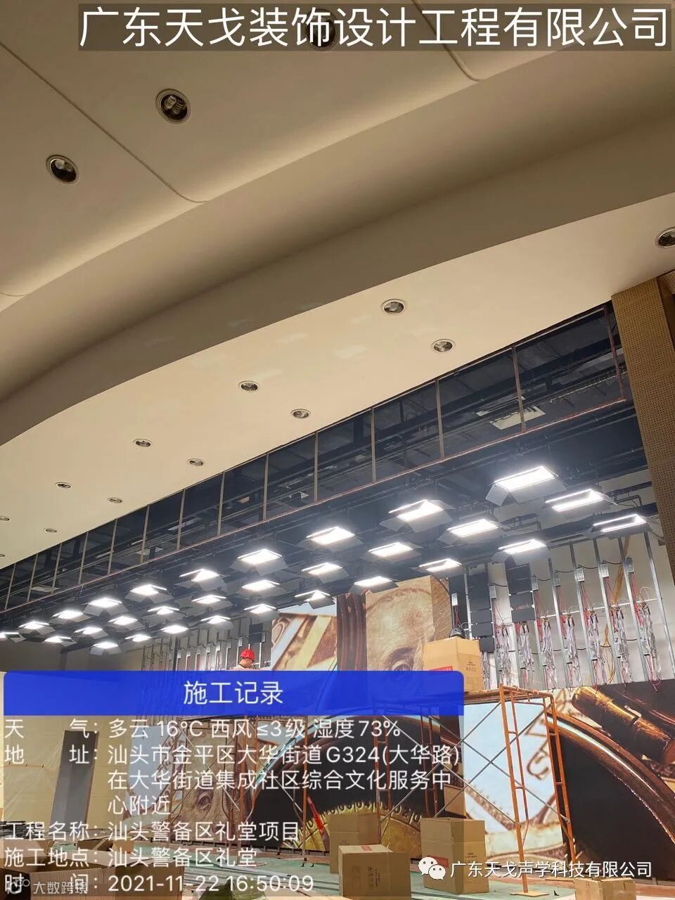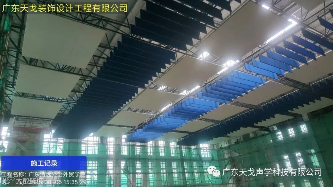 该项目做了三个场馆:体育馆、多功能报告厅、食堂;由于食堂人员比较多,吃饭时间噪音比较大,食堂的天花做了吸音改造,增加玻纤天花降低混响时间,总声学处理面积3086平方米。体育馆的声学装饰方面,天花面积362平方采用天戈声学自主生产的空间吸声体、墙面采用阻燃槽木吸音板。报告厅声学处理面积615平方,场所可容纳350座,此项目难点:体育馆空间高,多功能报告厅空间低且因项消防及排水管不到位,天花造型复杂梯级多,需要装饰铝板与吸音板相结合,导致施工难度大,天戈声学专门成立专项小组攻克安装难题。而天花采用的是天戈声学自主研发的铝穿孔吸音板。三个场所,均由天戈声学整体 设计、材料生产、施工,工期仅用2个月顺利完成,并且经过现场声学测试,达到了预期的要求。