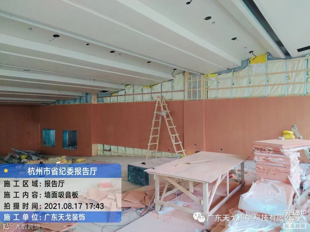 杭州中央纪委监察部杭州培训中心是中央纪委监察部所属三个纪检监察干部培训基地之一,创办于1990年4月,占地65亩,建筑面积45000平方米。各类报告厅、多媒体教室、会议室、讨论室27个。其中1-2楼重要会议纪要报告厅声学装饰部分由广天戈声学整体施工完成,采用自主研发A级防火穿孔吸音板、防火布艺吸声软包。