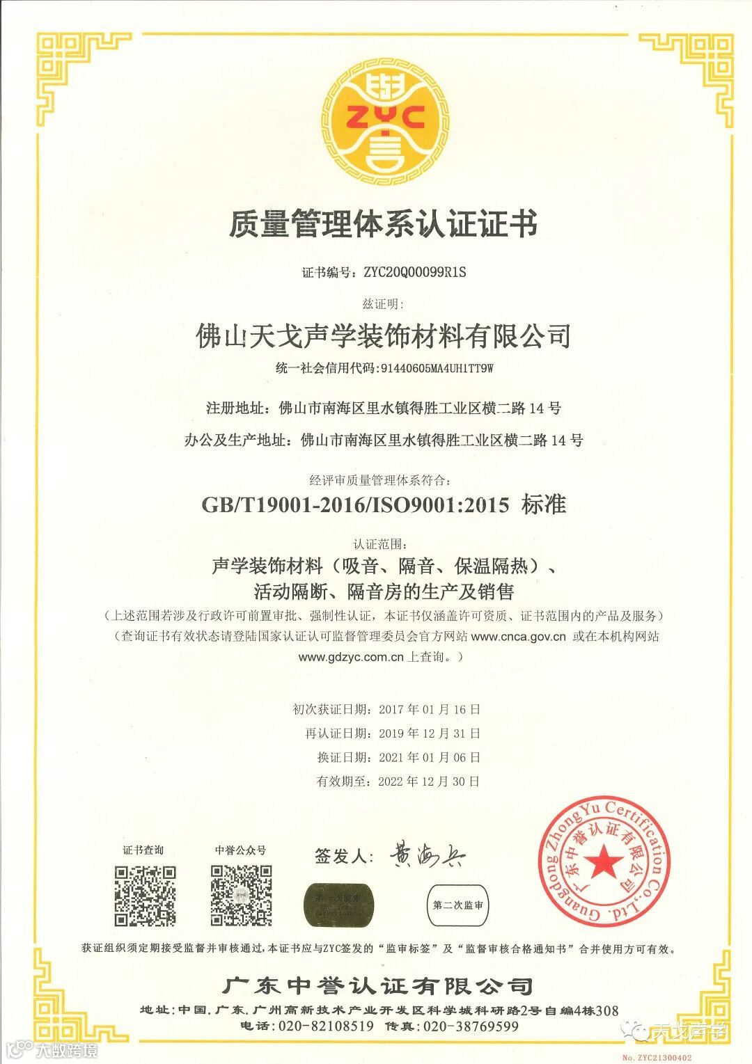 天戈声学是国家《民用建筑隔声设计规范》和《超大公共空间建筑声学设计规范》参编单位,中国舞台与美术学会剧院建筑技术委员会专家委员单位,广东省装饰设计协会副会长单位,拥有自主知识产权的专利产品50多种。天戈工厂获ISO9001,ISO14001,ISO45001认证,天戈产品获得欧盟CE认证、法国必维认证和国内外各种权威检测报告近150+项,同时我司还具有建筑声学设计一级、建筑装饰施工二级资质和建筑装饰工程专项设计乙级资质。天戈声学,让饰界拥有天籁之音。