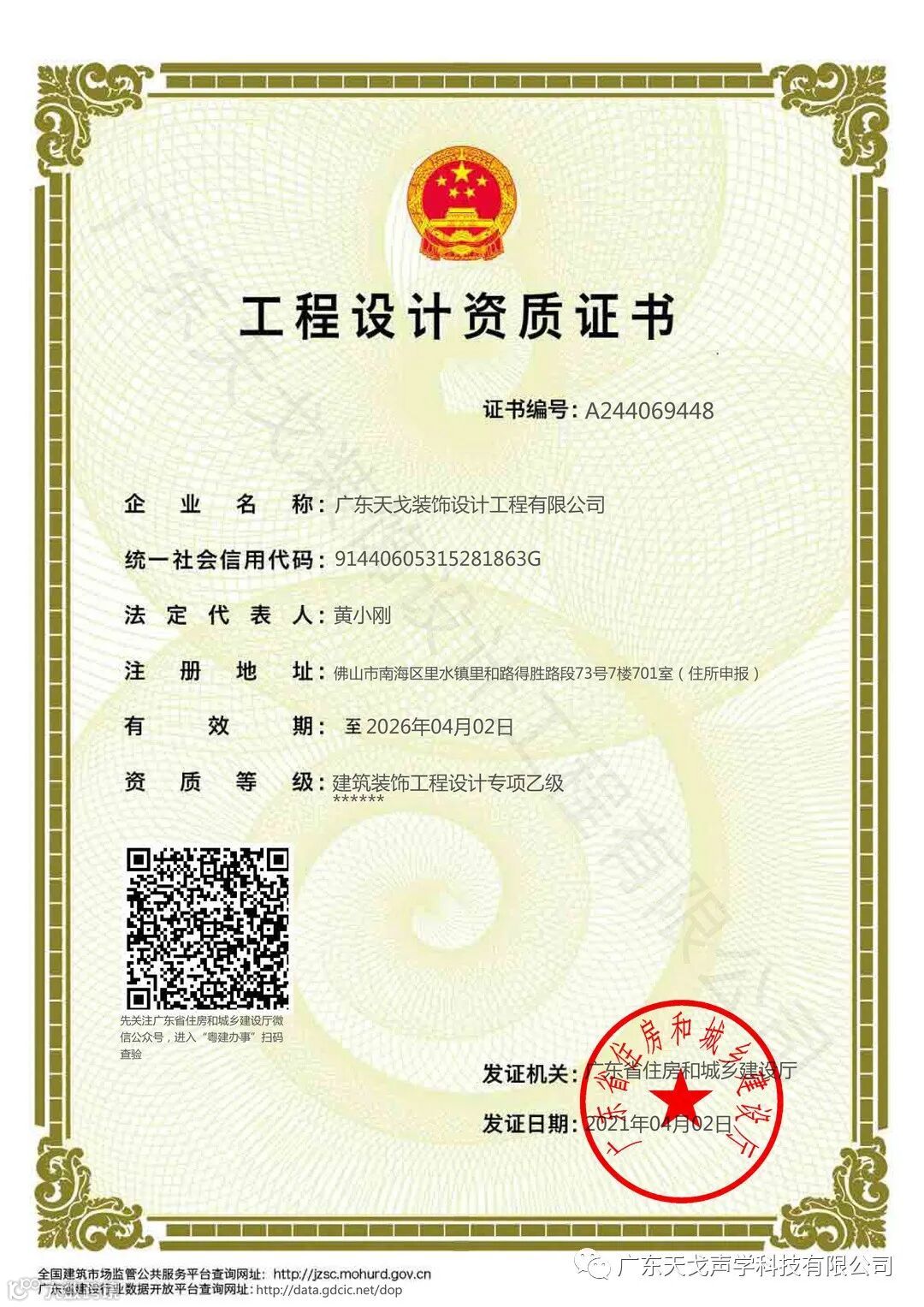 天戈声学装饰拥有国家建筑声学设计与监理一级、建筑装饰设计专项乙级、建筑装饰工程施工专业承包二级资质。我们拥有专业的装饰设计师15人、资深建筑声学设计师8人,灯光音响设计师5人,拥有建造师资格的工程项目经理10人。
