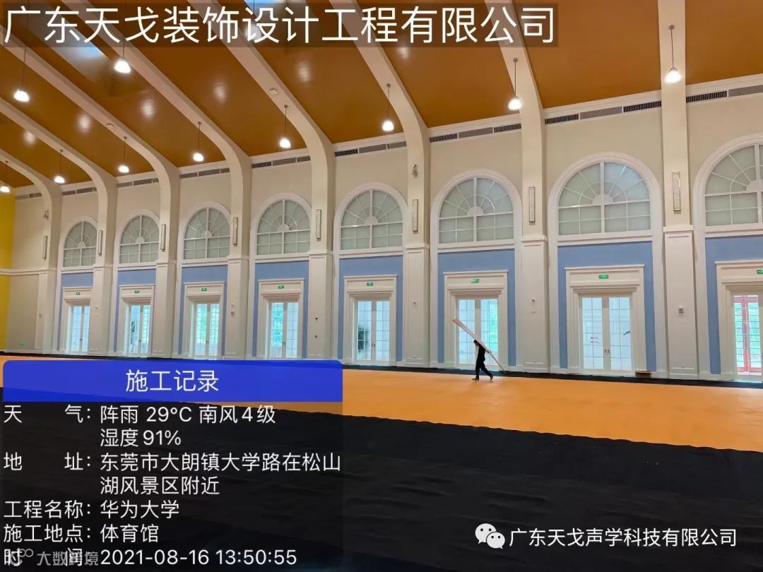 此项目为华为总部大学室内的篮球体育馆降噪改造工程,占地面积2252平方米,场馆容纳600座,天花部分改造施工的材料使用的是天戈声学自主研发生产A级防火铝穿孔吸音板。工程难点因整体的高度达到17.9米,地面木地板已经安装完成,无法使用登高车等高空设施,针对此问题我们改造使用为活动脚手架高空作业施工,铺设地面的保护,使用保护膜、9厘厚的阻燃夹板以及防潮地毯 三层的地面保护,改造完工后混响时间由原先的1.9秒降低到1.3秒,而且根据华为的环保高要求,施工现场场馆四周都做了现场围蔽的环境保护。整个F2EPC项目工期时间紧,仅用23天完工。
